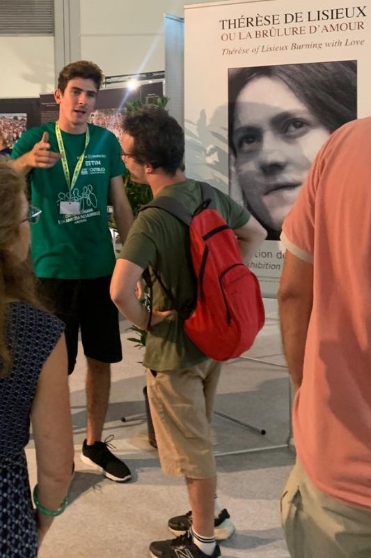 Pietro présente une exposition sur sainte Thérèse lors d’un meeting à Rimini (Italie).