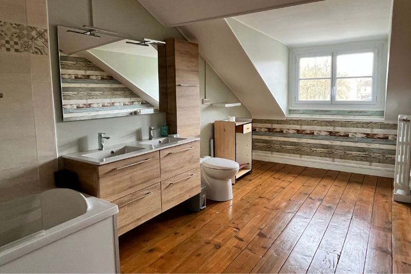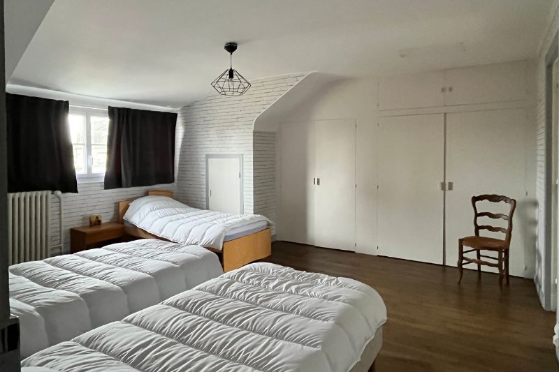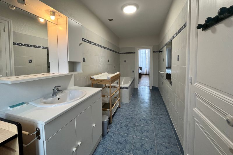 Au 1er étage : chambre (1 lit double, 1 lit simple), chambre (1 lit double), chambre (3 lits simples), petite salle de bain, grande salle de bain, toilettes.
